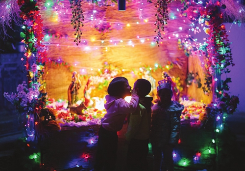Children look at Christmas statues in Cizhong village. Photo: Li Hao/GT