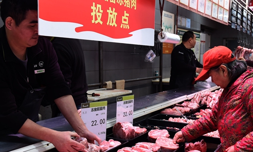 A resident buys frozen pork at a supermarket in Southwest China's Chongqing Municipality on Wednesday. The city decided to release a total of 11,000 tons of frozen pork from its reserves within 40 days to guarantee supply during the New Year and Spring Festival holidays. The retail price of pork is 44 yuan ($6.3) per kilogram. Photo: cnsphotos