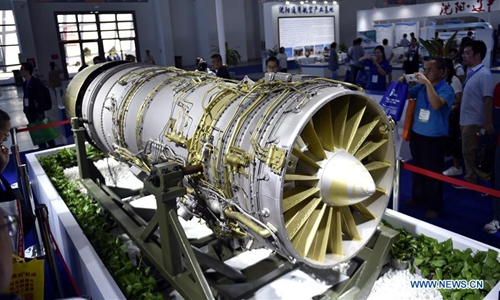 Visitors look at a model of the Taihang turbofan engine displayed at the 17th China International Equipment Manufacturing Exposition in Shenyang, capital of northeast China's Liaoning Province, Sept. 1, 2018. The expo, featuring robots and intelligence industry, has drawn more than 900 domestic and international companies. Photo:Xinhua