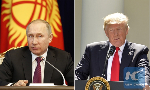 A combination of file photos show Russian President Vladimir Putin (L) at a news conference in Bishkek, Kyrgyzstan, on Feb. 28, 2017 and U.S. President Donald Trump at the White House in Washington D.C., the United States, on June 1, 2017. Photo:Xinhua