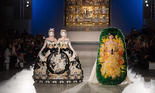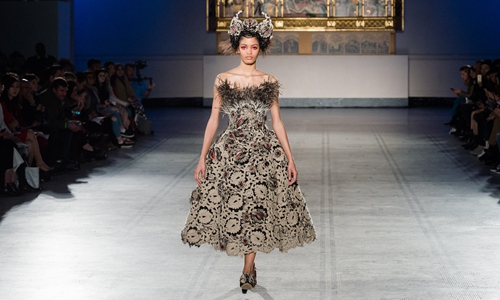 Models walk the ramp during Chinese designer Guo Pei's first ever runway show in the UK in November, 2019 in London, England. Photo: AFP