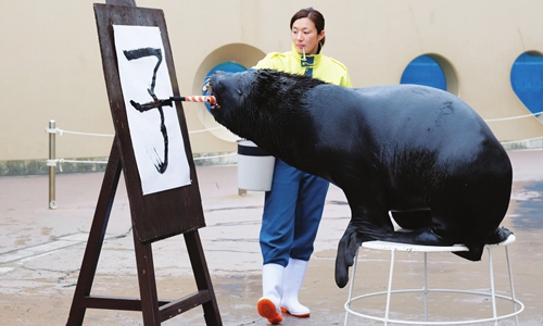 Sixteen-year-old sea lion "Leo" writes the Chinese character to represent the Year of the Rat at Hakkeijima Sea Paradise ahead of the upcoming Lunar New Year in Yokohama, suburban Tokyo, on Thursday. Photo: AFP