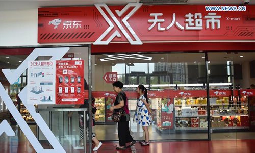 Customers enter the JD-running X-mart, a cashier-free supermarket, in north China's Tianjin, June 29, 2018. Operated by China's e-commerce giant JD.com, such supermarkets use technologies including the Internet of Things (IOT), artificial intelligence (AI) and biometrics to create an unmanned shopping experience. (Xinhua/Li Ran)