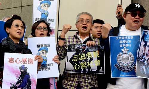 Citizens hold banners in support of police outside Hong Kong Police Headquarters in south China's Hong Kong, Nov. 22, 2019. Photo: Xinhua