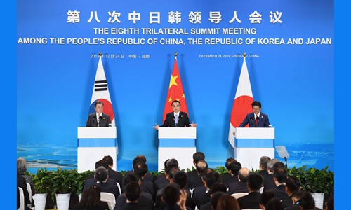 Photo taken on Dec. 24, 2019, shows Chinese Premier Li Keqiang meets the press with President of the Republic of Korea (ROK) Moon Jae-in and Japanese Prime Minister Shinzo Abe after the 8th China-Japan-ROK leaders' meeting in Chengdu, southwest China's Sichuan Province, Dec. 24, 2019. Photo: Xinhua