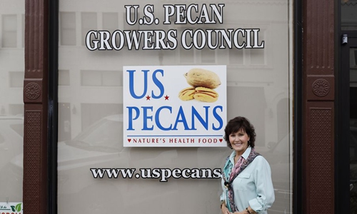Janice Dees, executive director and international marketing manager of U.S. Pecan Growers Council, poses for a photo outside her office in Tifton, Georgia, the United States, Oct. 25, 2019. Photo: Xinhua