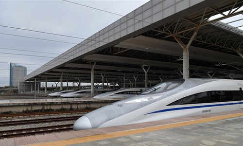 Photo taken on Dec. 26, 2019 shows the first high-speed train G5025 leaving Nanchang West Station after the opening of Nanchang-Ganzhou high-speed railway in Nanchang, capital of east China's Jiangxi Province. A high-speed railway opened on Thursday threading Nanchang, capital of east China's Jiangxi Province, Jinggangshan, the "cradle of the Chinese revolution," and China's rare earth base of Ganzhou. The high-speed railway with a design speed of 350 km per hour shortens the former train trip of more than 4 hours to less than 2 hours on the 418-km line. Photo: Xinhua
