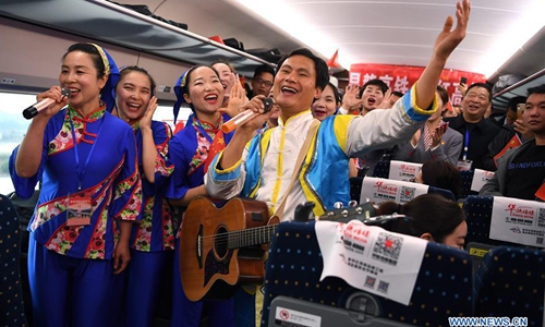 Performers sing for the passengers on a high-speed train G5033 running on the newly opened Nanchang-Ganzhou high-speed railway, Dec. 26, 2019. A high-speed railway opened on Thursday threading Nanchang, capital of east China's Jiangxi Province, Jinggangshan, the "cradle of the Chinese revolution," and China's rare earth base of Ganzhou. The high-speed railway with a design speed of 350 km per hour shortens the former train trip of more than 4 hours to less than 2 hours on the 418-km line. Photo: Xinhua