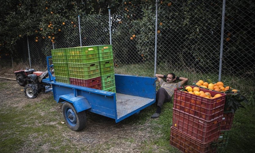 A farmer rests beside harvested oranges at a village in Mazandaran province, northern Iran, on Dec. 27, 2019. Oranges farms in northern Iran entered the harvest season recently. (Photo by Ahmad Halabisaz/Xinhua)