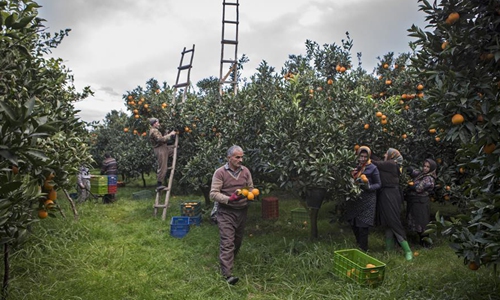 A farmer harvests oranges at a village in Mazandaran province, northern Iran, on Dec. 27, 2019. Oranges farms in northern Iran entered the harvest season recently. (Photo by Ahmad Halabisaz/Xinhua)