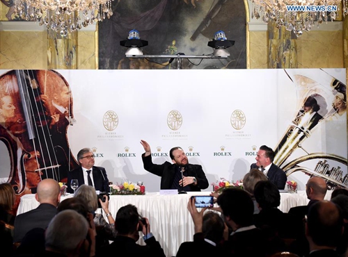Andris Nelsons (C), the conductor of the traditional New Year's concert, speaks during a news conference in Vienna, Austria, Dec. 27, 2019. The New Year Concert of Vienna is one of the most prestigious concerts in the world. (Xinhua/Guo Chen)