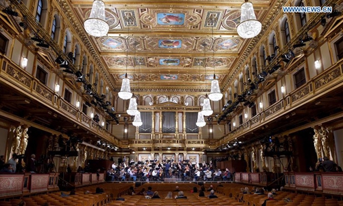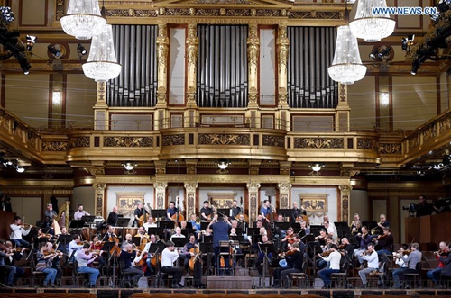 Photo taken on Dec. 27, 2019 shows the scene of the rehearsal of the traditional New Year's concert at the golden hall of Vienna's Musikverein in Vienna, Austria. The New Year Concert of Vienna is one of the most prestigious concerts in the world. (Xinhua/Guo Chen)