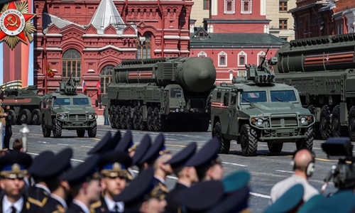 A Russian RS-24 Yars intercontinental ballistic missile system rolls down the Red Square during a rehearsal for the Victory Day parade in Moscow, Russia, May 7, 2019. (Xinhua/Bai Xueqi)