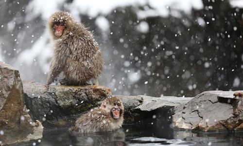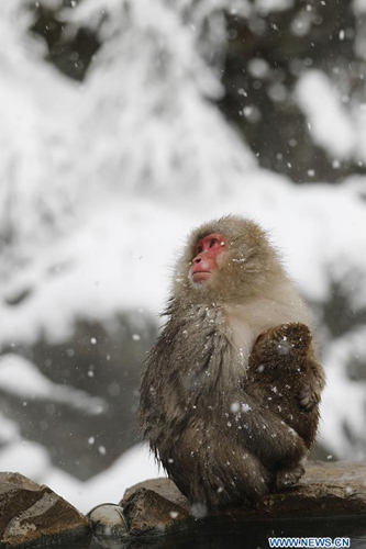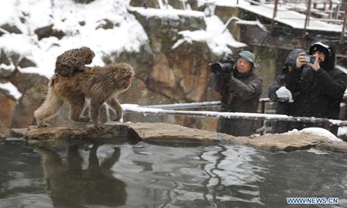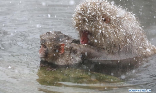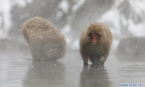 Snow monkeys, also known as Japanese macaques, enjoy hot spring at Jigokudani Yaen-koen in Nagano, Japan, Dec. 27, 2019. Photo:Xinhua