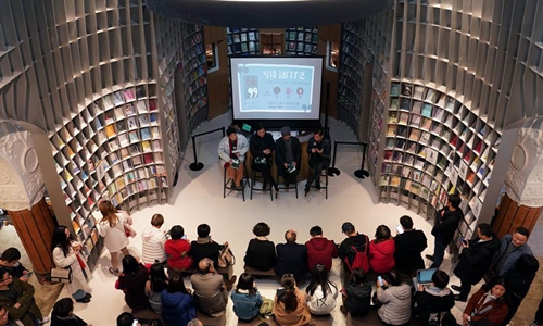 A poem themed salon is held at a poetry themed bookstore in Shanghai, east China, on Dec. 28, 2019. The bookstore called Si'nan Books-Poetry Bookstore started business on Saturday. Photo:Xinhua