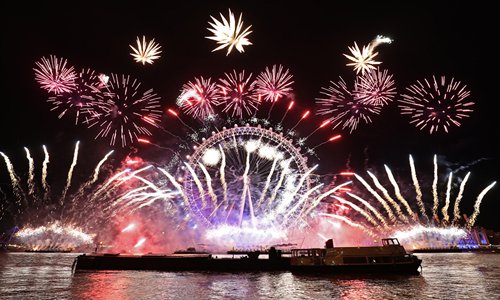 New Year's Eve fireworks light up the London Eye on the River Thames in central London, UK on January 1, 2018. Photo: VCG