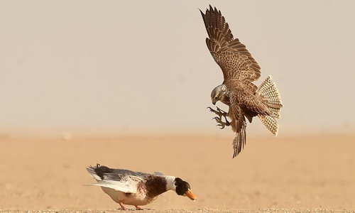 A falcon hunts during a training show in Jahra Governorate, Kuwait, Dec. 28, 2019. Kuwaiti falcon lovers held on Saturday a falcon training show in the desert of Jahra Governorate to introduce how falcons hunt in desert. (Xinhua)