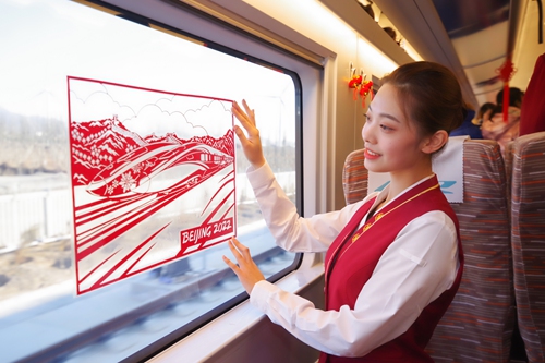 A stewardess places paper cutting on the window of the high-speed train G2505, which stops at Zhangjiakou Highspeed Railway Station in Zhangjiakou, North China's Hebei province on Monday. The high-speed railway line went into service on Monday. Photo: China News Service
