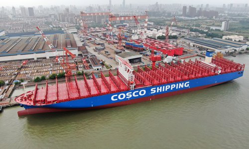 The COSCO Shipping Aquarius, a 20,000 20-foot equivalent unit containership built by Nantong COSCO KHI Ship Engineering Co, started test operations on Monday. The ship is 400 meters long with a maximum load of 197,000 tons. The vessel will join the AEU1 shipping route, one of the Belt and Road Initiative's main shipping lines connecting Asia and Europe. Photo: IC