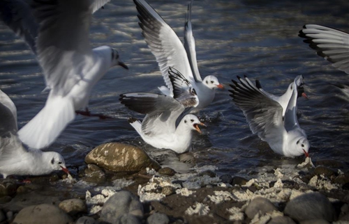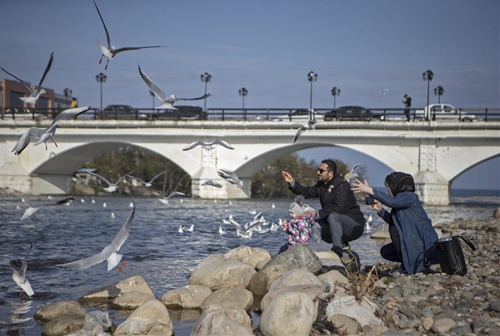 People feed migratory birds in Tonekabon city, northern Iran, Dec. 29, 2019. (Photo by Ahmad Halabisaz/Xinhua)