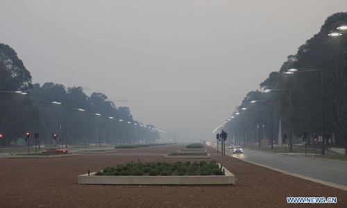 Photo taken on December 17, 2019 shows the smoke-shrouded street in Canberra, Australia. Air pollution caused by bushfires continues in Canberra. (Photo by Chu Chen/Xinhua)