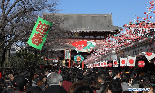 People go to Senso-ji temple for Hatsumode, or their first temple visit of the year, at Senso-ji Temple in Asakusa area, Tokyo, Japan, Jan. 1, 2020. (Xinhua/Du Xiaoyi)