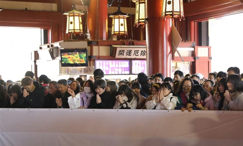 People make wishes during Hatsumode, or their first temple visit of the year, at Senso-ji temple in Asakusa area, Tokyo, Japan, Jan. 1, 2020. (Xinhua/Du Xiaoyi)
