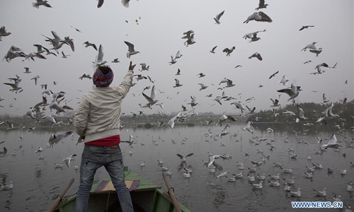 A man feeds migratory birds at Yamuna river in New Delhi, India, Dec. 31, 2019. (Xinhua/Javed Dar)