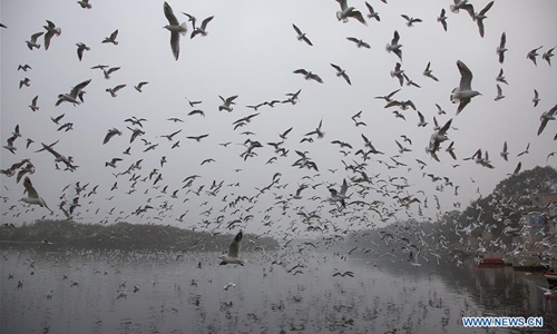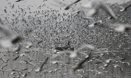 Migratory birds are seen at Yamuna river in New Delhi, India, Dec. 31, 2019. (Xinhua/Javed Dar)