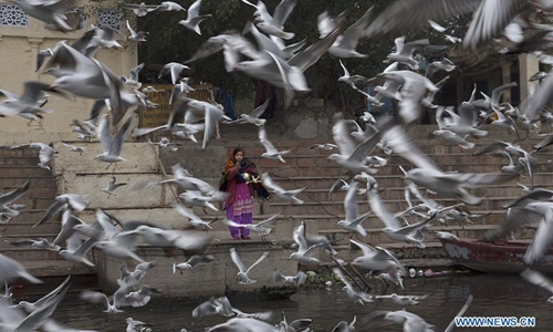 A woman feeds migratory birds at Yamuna river in New Delhi, India, Dec. 31, 2019. (Xinhua/Javed Dar)