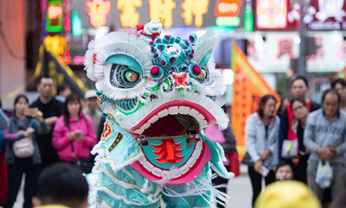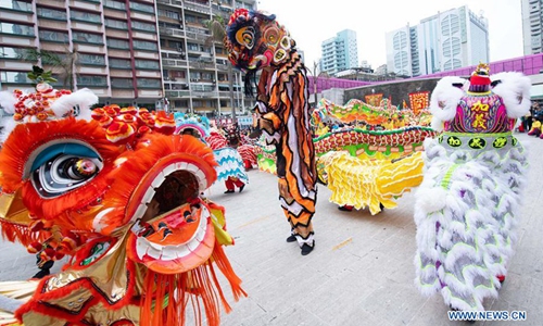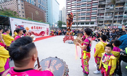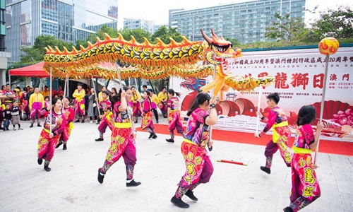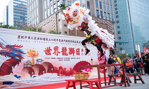 Actors perform a lion dance during the Macao International Dragon and Lion Dance Day event at Praca da Amizade (Friendship Square) in Macao, south China, Jan. 1, 2020. Photo:Xinhua