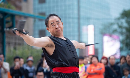 An actor performs martial arts during the Macao International Dragon and Lion Dance Day event at Praca da Amizade (Friendship Square) in Macao, south China, Jan. 1, 2020. Photo:Xinhua
