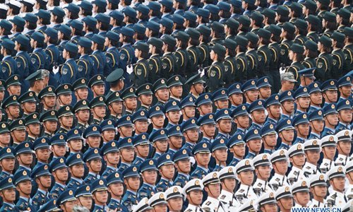 Chinese soldiers take part in parade training for the upcoming National Day celebrations in Beijing, capital of China, Sept. 11, 2019. Participants are busy preparing for the scheduled military parade in Beijing to celebrate the 70th anniversary of the founding of the People's Republic of China on Oct. 1. (Xinhua/Li Gang)