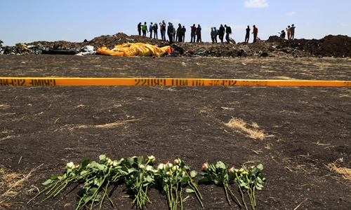 Flowers are put at the site of the Boeing 737 MAX crash in Ethiopia in March 2019. Photo: CNSPhoto