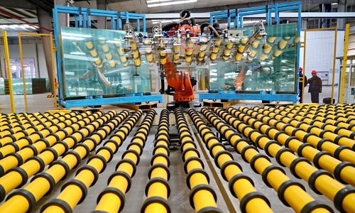 Workers operate a robot on a production line in a glass factory in Qinhuangdao, North China's Hebei Province on Saturday. In line with the country's massive industrial upgrading, Qinhuangdao has been investing heavily in modernizing its manufacturing sector. The project at the glass factory will cost up to 510 million yuan ($72.79 million). Photo: CNS Photo