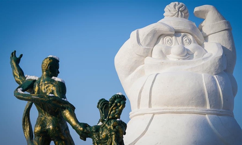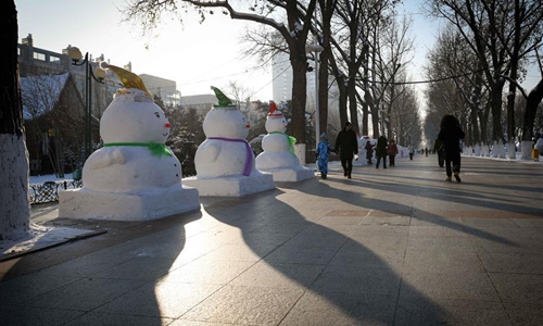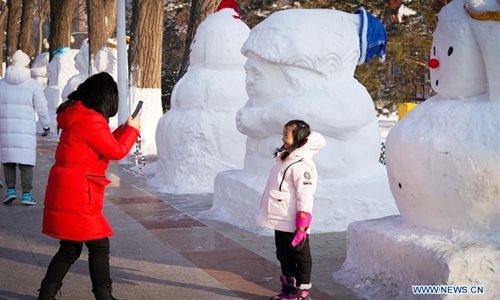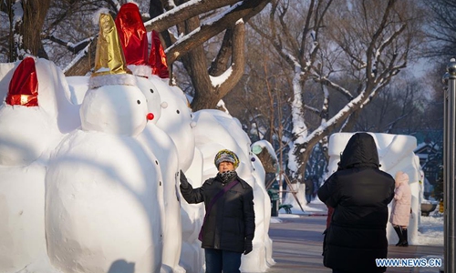 Pedestrians watch a snowman in Harbin, capital of northeast China's Heilongjiang Province, Jan. 2, 2020. A total of 2,020 snowmen are standing in the city to greet the New Year. (Xinhua/Wang Song)