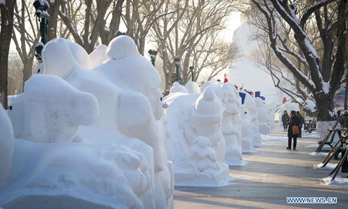 Pedestrians walk past snowmen on a street of Harbin, capital of northeast China's Heilongjiang Province, Jan. 2, 2020. A total of 2,020 snowmen are standing in the city to greet the New Year. (Xinhua/Wang Song)