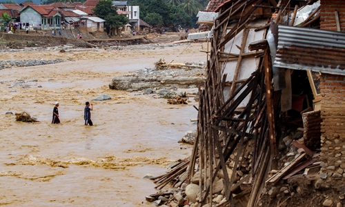 Villagers make their way across a river after the bridge was destroyed by a flood at the Banjar Irigasi village in Lebak, Banten province on Thursday. Indonesia's disaster agency warned of more deaths after torrential rains pounded the Jakarta region, triggering floods and landslides that killed at least 23 and left vast swaths of the megalopolis underwater. Photo: AFP