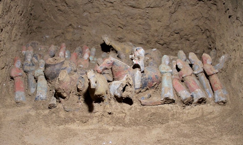 Photo taken on Nov. 13, 2019 shows discovered pottery figures from an ancient tomb in Xixian New District, northwest China's Shaanxi Province. (Xinhua/Li Yibo)