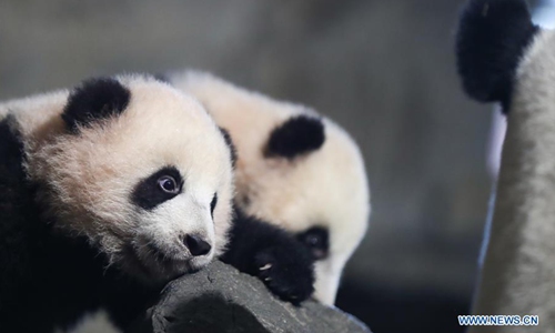 Giant panda cubs Bao Di and Bao Mei rest at the Pairi Daiza zoo in Brugelette, Belgium, Dec. 31, 2019. Giant panda Hao Hao gave birth to twin cubs Bao Di and Bao Mei in August 2019. (Xinhua/Zhang Cheng)