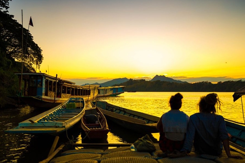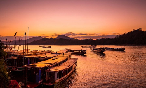 Photo taken on Jan. 1, 2020 shows the sunset scenery of Luang Prabang on the riverside of Mekong River, Laos.(Xinhua/Kaikeo Saiyasane)