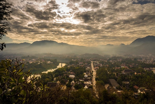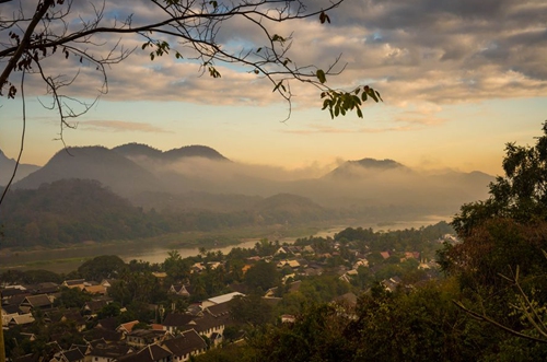 Photo taken on Jan. 2, 2020 shows the sunrise scenery of Luang Prabang on the riverside of Mekong River, Laos.(Xinhua/Kaikeo Saiyasane)