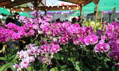 The pavilion of fresh flowers is seen at an outdoor farmers' market in Hong Kong, south China, Jan. 3, 2020. The largest outdoor farmers' market in Hong Kong opened on a warm winter Friday, inviting tides of crowds to enjoy a variety of local agricultural and fishery products. (Xinhua/Wu Xiaochu)