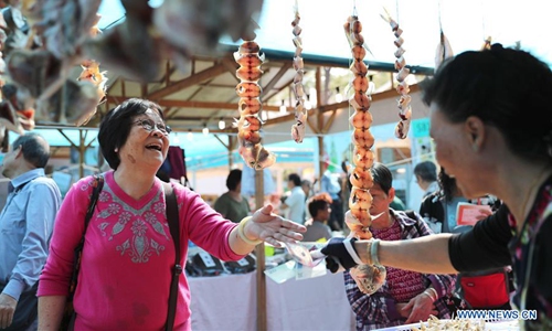 A customer (L) shops at a fish pavilion at an outdoor farmers' market in Hong Kong, south China, Jan. 3, 2020. The largest outdoor farmers' market in Hong Kong opened on a warm winter Friday, inviting tides of crowds to enjoy a variety of local agricultural and fishery products. (Xinhua/Wu Xiaochu)