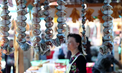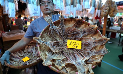 A staff of a fish pavilion displays fishery products at an outdoor farmers' market in Hong Kong, south China, Jan. 3, 2020. The largest outdoor farmers' market in Hong Kong opened on a warm winter Friday, inviting tides of crowds to enjoy a variety of local agricultural and fishery products. (Xinhua/Wu Xiaochu)