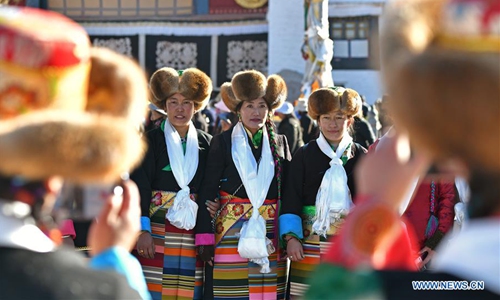 Women of the Tibetan ethnic group celebrate the Fairy's Day on the Barkhor Street in Lhasa, capital of southwest China's Tibet Autonomous Region, Dec. 10, 2019. The Fairy's Day, known as the "Women's Festival" in modern Tibet, is celebrated on the 15th day of the 10th month in the Tibetan calendar. The festival is to commemorate Buddha Aleanterre Brahm. During the Fairy's Day celebration, women are dressed in their most beautiful clothes and go to temples to present the traditional ceremonial scarf "Hada" to their honorable goddess and make wishes. In Lhasa, people flood the Barkhor Street around the ancient Jokhang Temple. Girls and women decorate themselves elaborately. In addition to religious activities, they also enjoy the festival by going shopping and having magnificent food. Believers from all over Tibet would gather at the Jokhang Temple, where they burn aromatic plants and pray. (Xinhua/Li Xin)