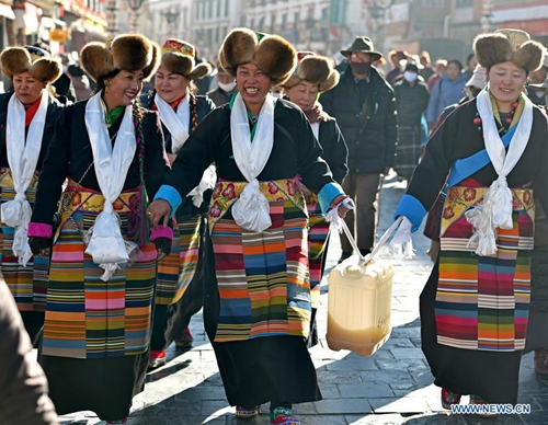 Women of the Tibetan ethnic group bring highland barley wine to be blessed at the Jokhang Temple for the Fairy's Day celebration in Lhasa, capital of southwest China's Tibet Autonomous Region, Dec. 10, 2019. The Fairy's Day, known as the "Women's Festival" in modern Tibet, is celebrated on the 15th day of the 10th month in the Tibetan calendar. The festival is to commemorate Buddha Aleanterre Brahm. During the Fairy's Day celebration, women are dressed in their most beautiful clothes and go to temples to present the traditional ceremonial scarf "Hada" to their honorable goddess and make wishes. In Lhasa, people flood the Barkhor Street around the ancient Jokhang Temple. Girls and women decorate themselves elaborately. In addition to religious activities, they also enjoy the festival by going shopping and having magnificent food. Believers from all over Tibet would gather at the Jokhang Temple, where they burn aromatic plants and pray. (Xinhua/Li Xin)
