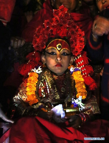 Nepal's Living Goddess Kumari participates in an annual ceremony for worshiping the deity of Machhendranath in Kathmandu, capital of Nepal, Jan. 3, 2020. Seto Machhendranath is known as the god of rain and both Hindus and Buddhists worship Machhendranath for good rain to prevent drought during the rice harvest season. (Photo by Sunil Sharma/Xinhua)