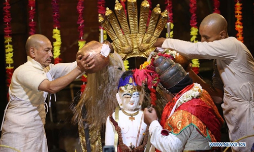 Priests bath an idol of Seto Machhendranath during an annual ceremony for worshiping the deity of Machhendranath in Kathmandu, capital of Nepal, Jan. 3, 2020. Seto Machhendranath is known as the god of rain and both Hindus and Buddhists worship Machhendranath for good rain to prevent drought during the rice harvest season. (Photo by Sunil Sharma/Xinhua)
