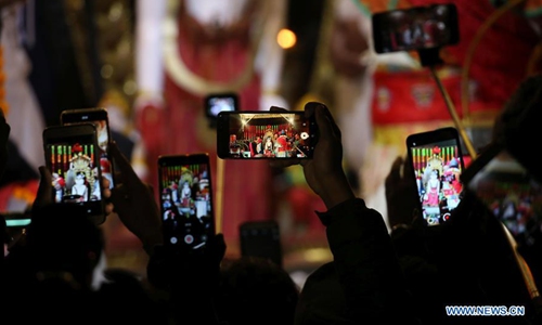 People take photos during an annual ceremony for worshiping the deity of Machhendranath in Kathmandu, capital of Nepal, Jan. 3, 2020. Seto Machhendranath is known as the god of rain and both Hindus and Buddhists worship Machhendranath for good rain to prevent drought during the rice harvest season. (Photo by Sunil Sharma/Xinhua)